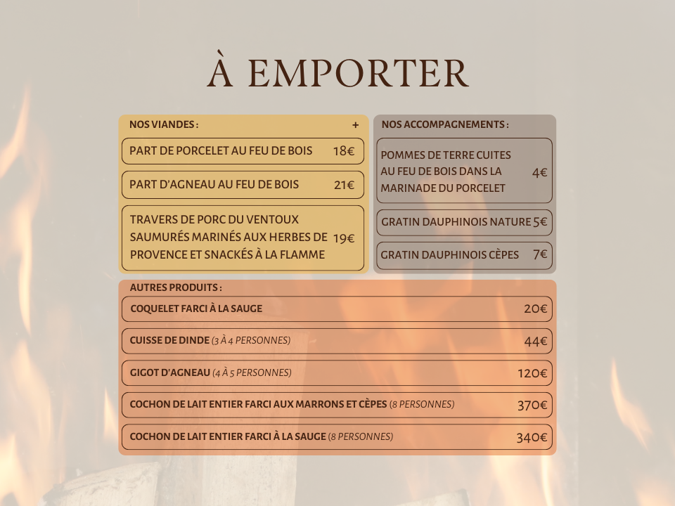 Découvrez des viandes cuites au feu de bois et à la broche : porcelet, agneau, travers de porc du Mont Ventoux, accompagnés de gratins dauphinois généreux. Un lieu convivial à partager en famille ou entre amis, en salle ou extérieur.